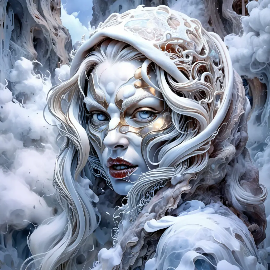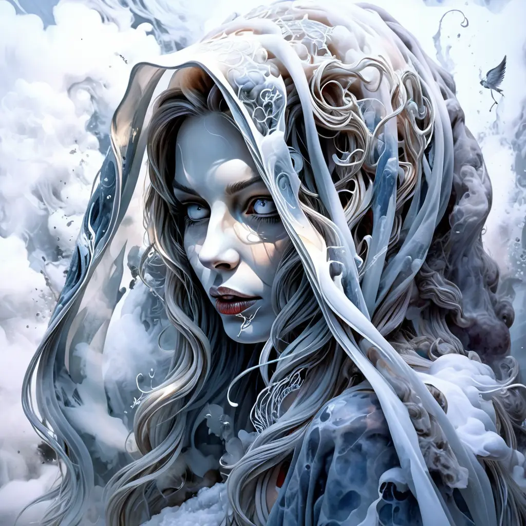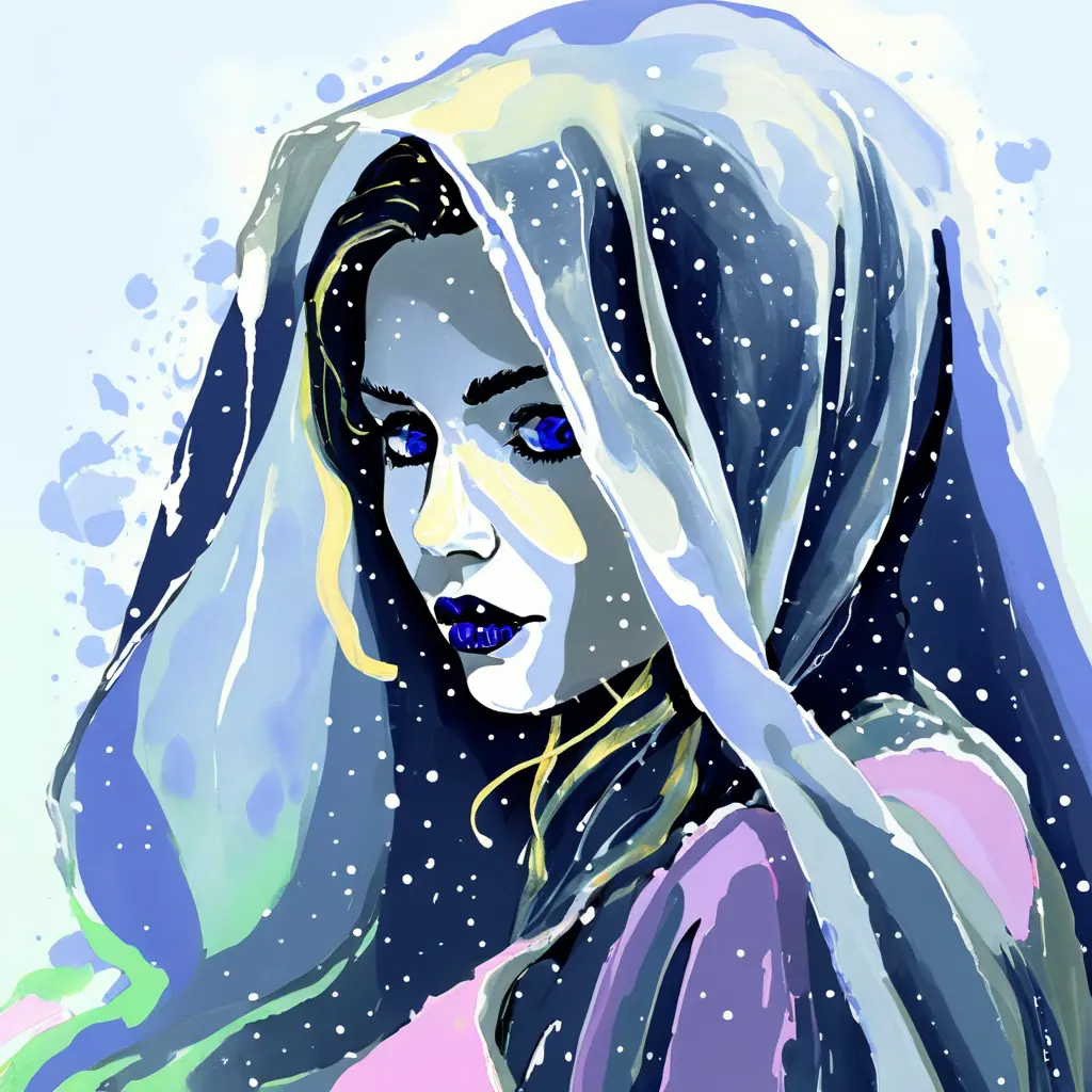 lady of the winter, extrem close up, sexy and mysterious silhouette, billowing transparent veil, watercolor painting, graffiti style, fantasy concept art, artistic photorealism, smooth, great masterwork by head of prompt engineering, amazing depth , simple background, great brush artwork
