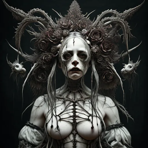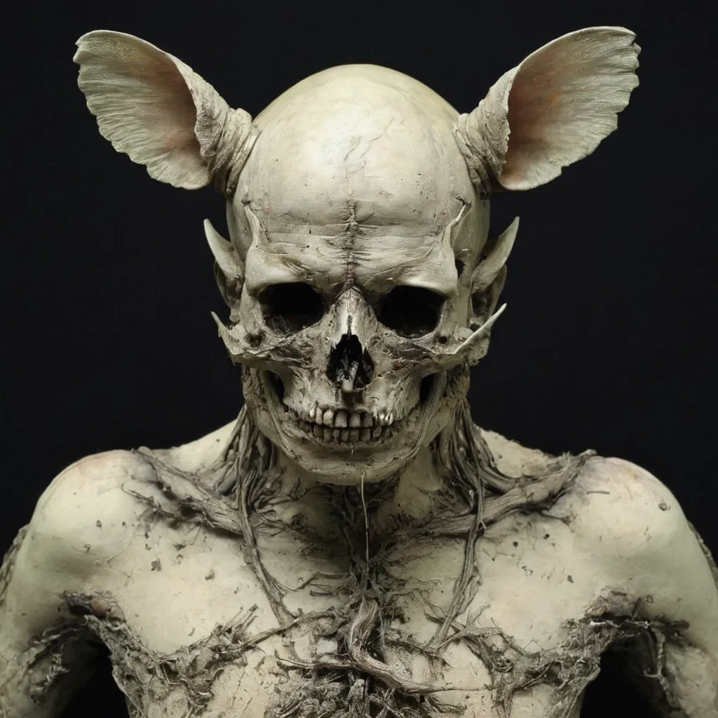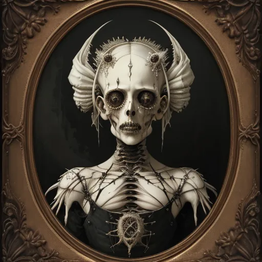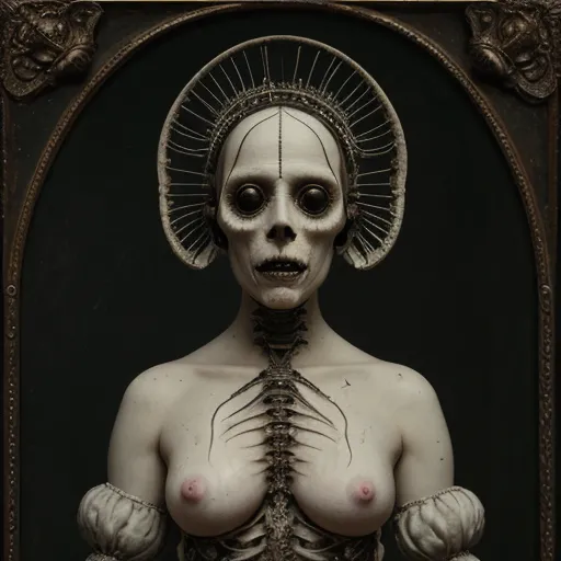 • Тема смерти и тлена: Часто присутствуют черепа, кости и распадающиеся структуры.