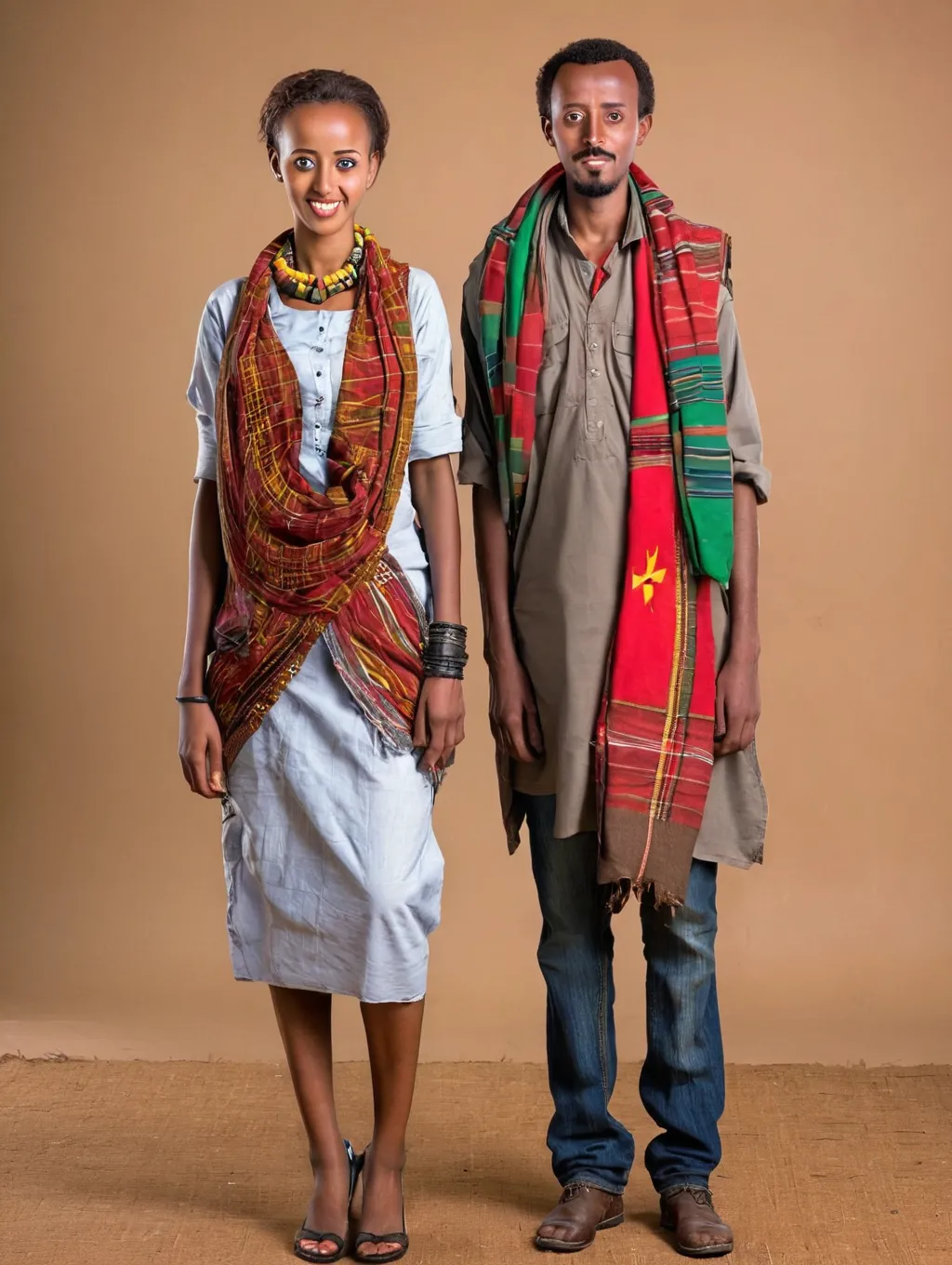 ethiopian (Эфиопский) — Человек с добавленными эфиопскими элементами будет представлять собой слияние культурной традиции и истории Эфиопии. Одежда может включать в себя белые хлопковые одеяния с цветными вышивками у шеи и на краях и широкими рукавами, как это делают эфиопские народы при различных религиозных и культурных мероприятиях. Волосы могут быть африканского стиля, короткими или нарощенными, завязанные традиционными эфиопскими шарфами. В руках персонажа могут быть традиционные эфиопские музыкальные инструменты, такие как кебера, вашинто, масинка или масенко. Фон изображения может отражать разнообразные пейзажи Эфиопии, такие как горы, долины, храмы и руины знаменитого города Лалибела, или афарские долины с их загадочными стоями каменных столбов.