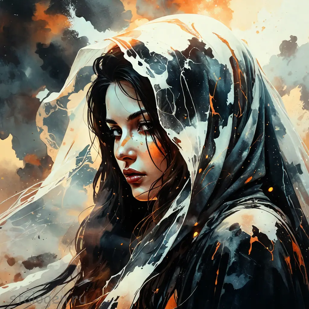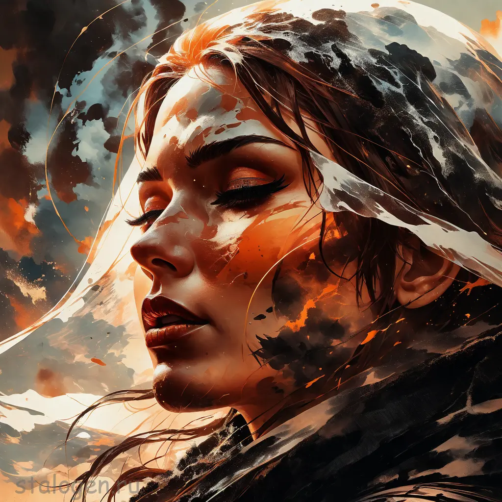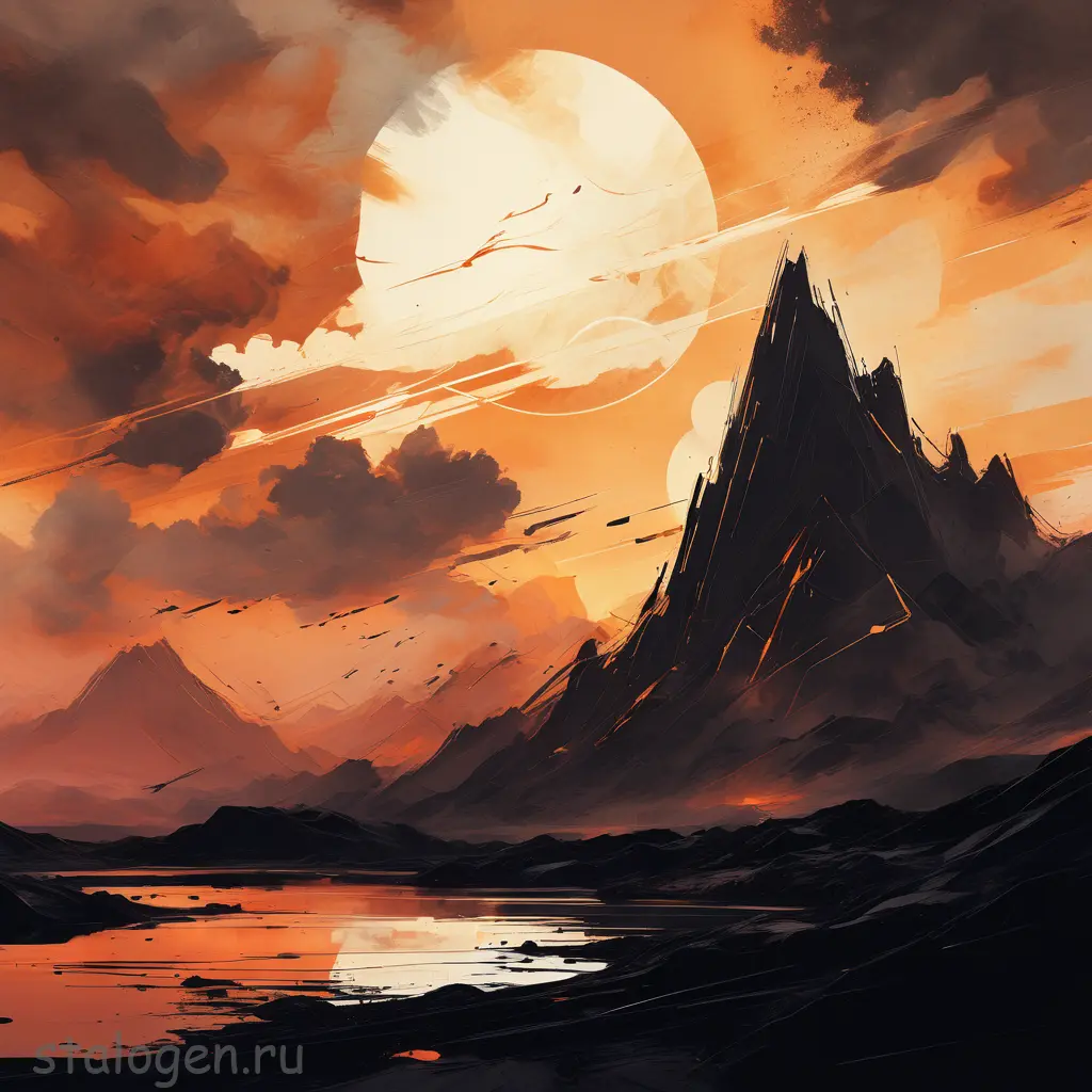 futuristic sci-fi ink painting, cinematic landscape, expressive brushstrokes, geometric natural forms, atmospheric sunset, dynamic movement, calligraphic sky, traditional ink realism, digital abstraction, monochromatic contrast, soft gradients, stylized clouds, glowing sun, mountain silhouettes, futuristic nature aesthetic, organic geometry, visual poetry, surreal realism