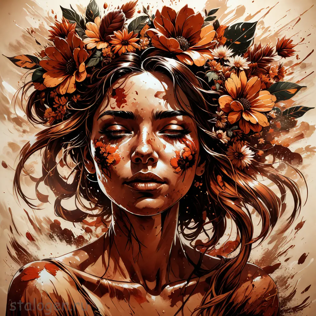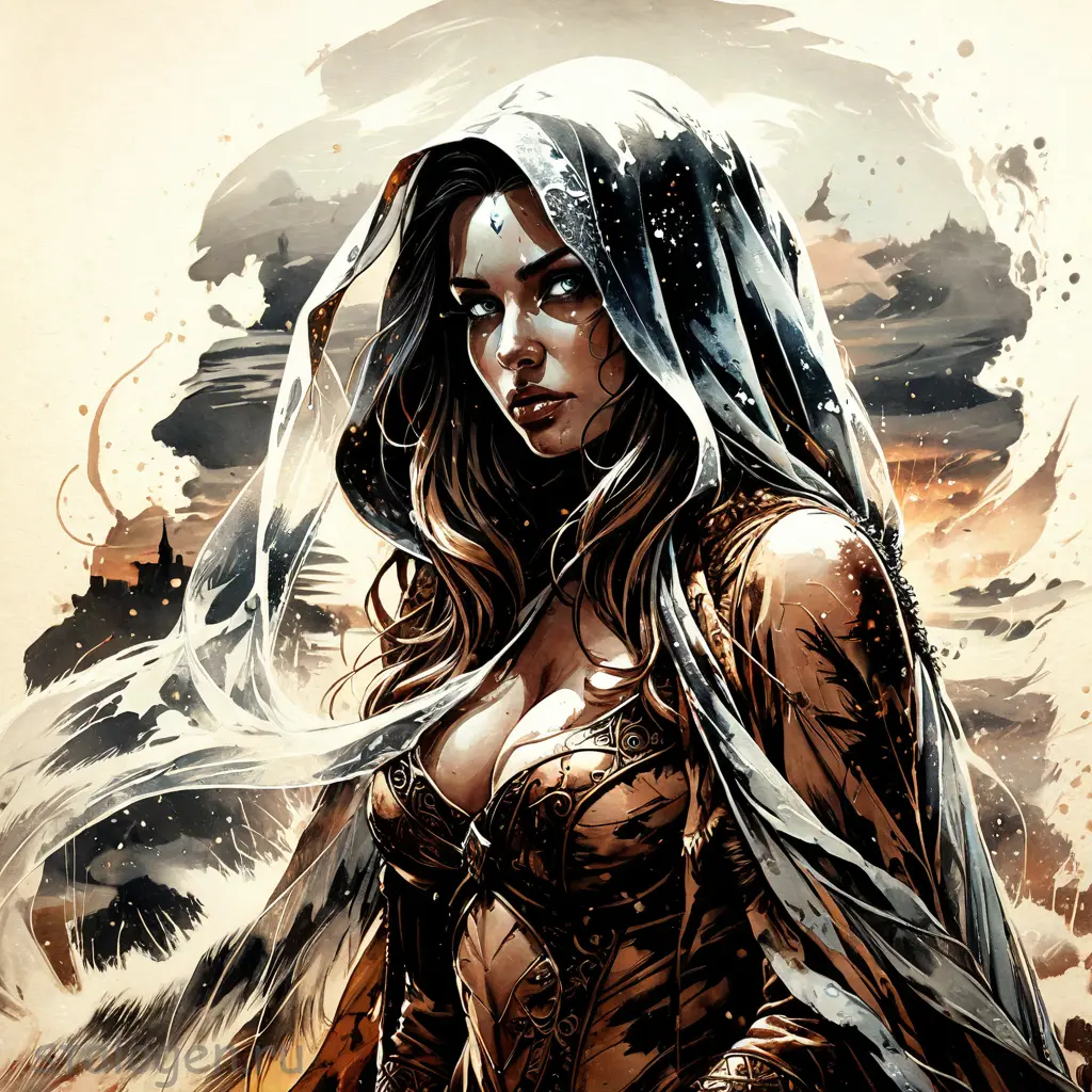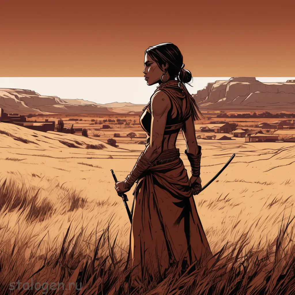 fiery woman cheyenne, High contrast, minimalistic, colored, stark, dramatic, graphic novel illustration, hatching, traditional outfits, grassy landfields, seminole war complexe background, comics, style by Antoine Aurety, flat colors, dark brownish gradient colored background with hills and canyon town, grain paper, noisy, high passes