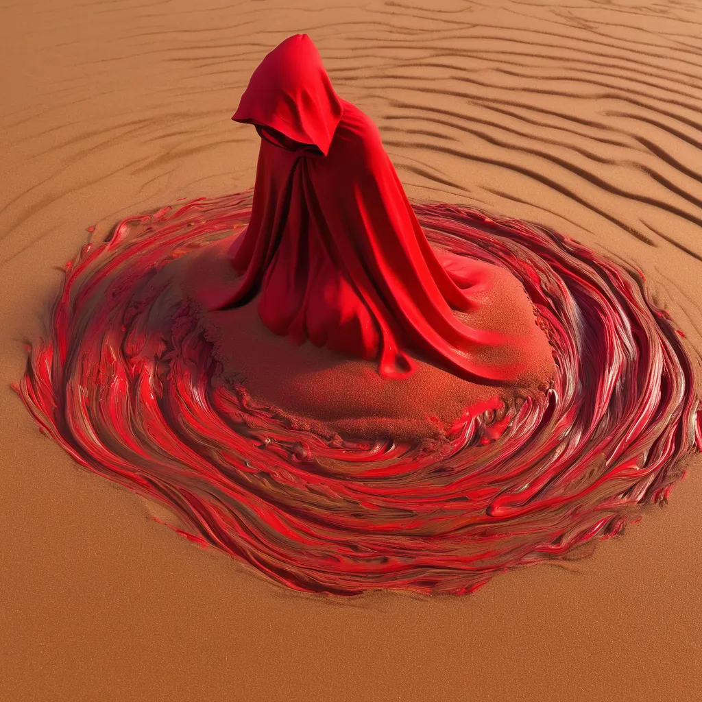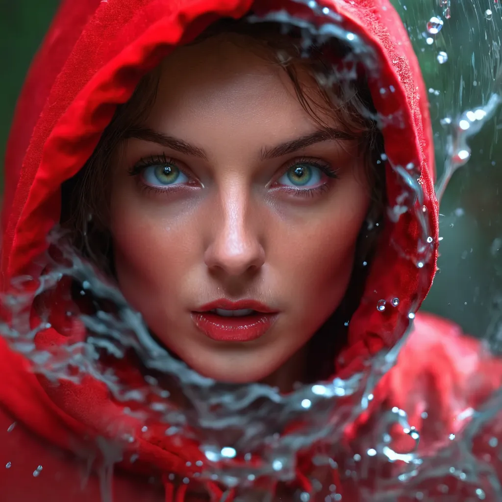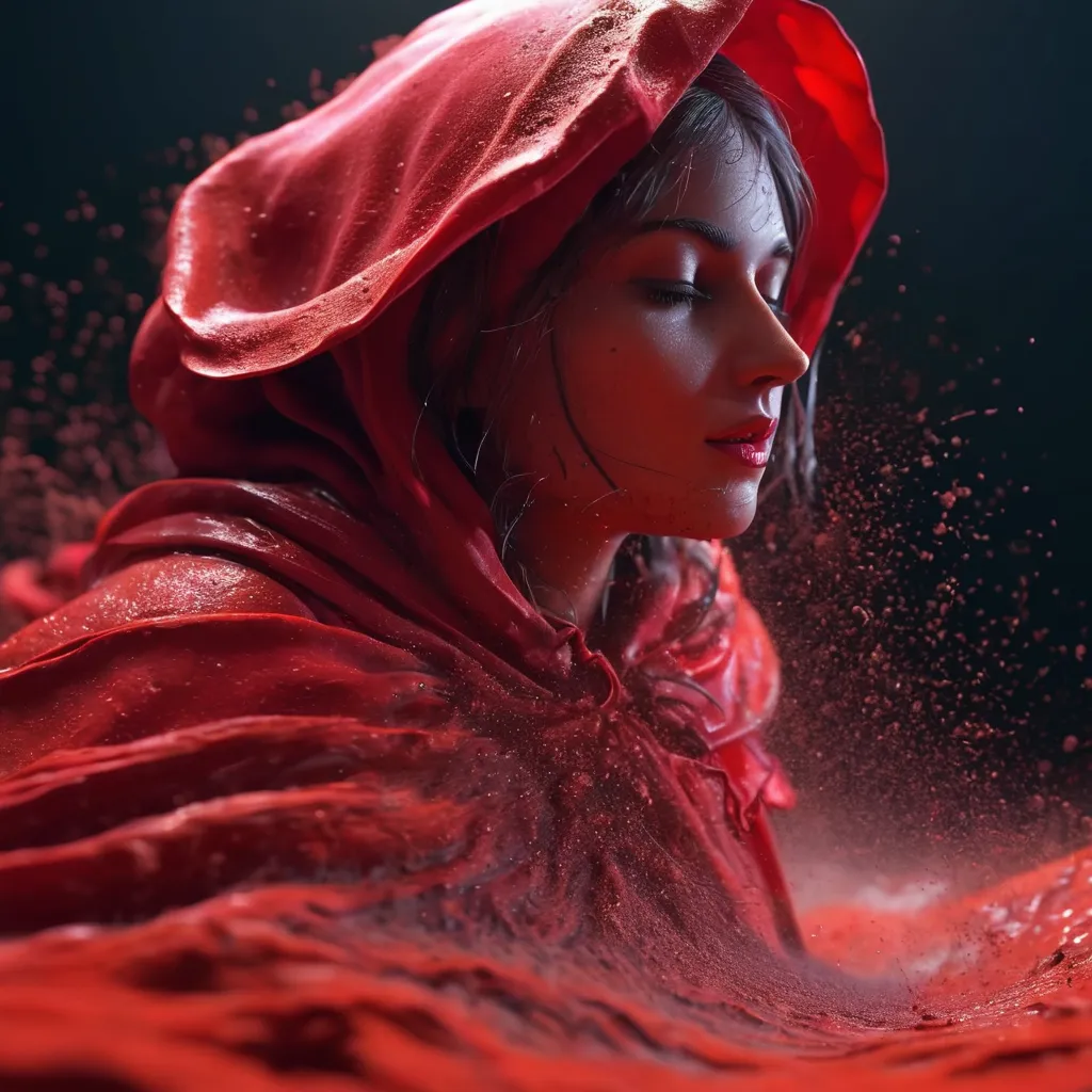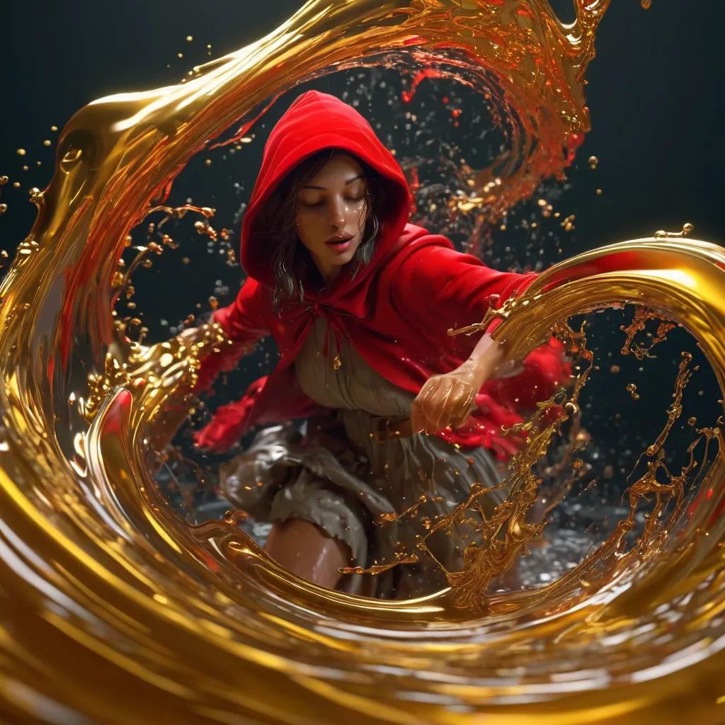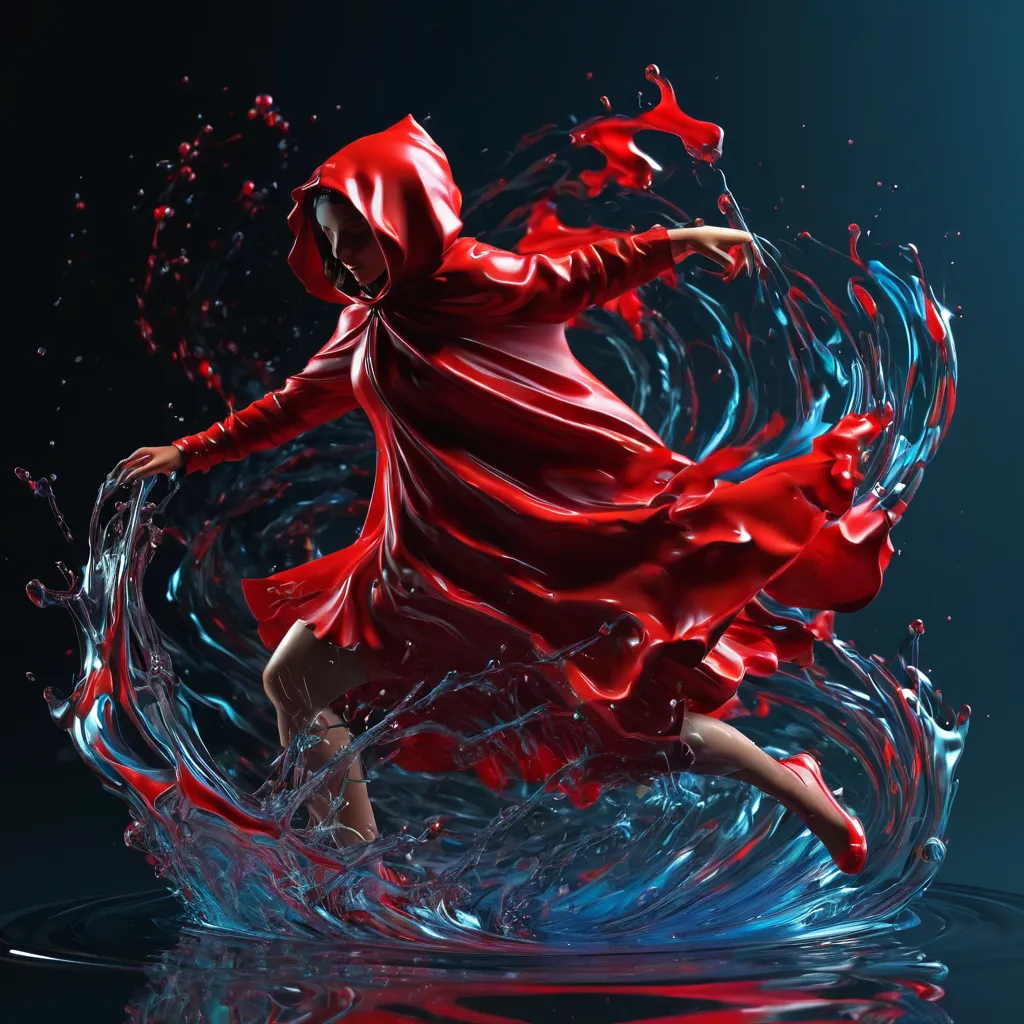 Little Red Riding Hood, fluid {Материал} dynamics art style, vibrant contrasting colors, simulation of fluid {Материал} dynamics, swirling motion, volumetric
