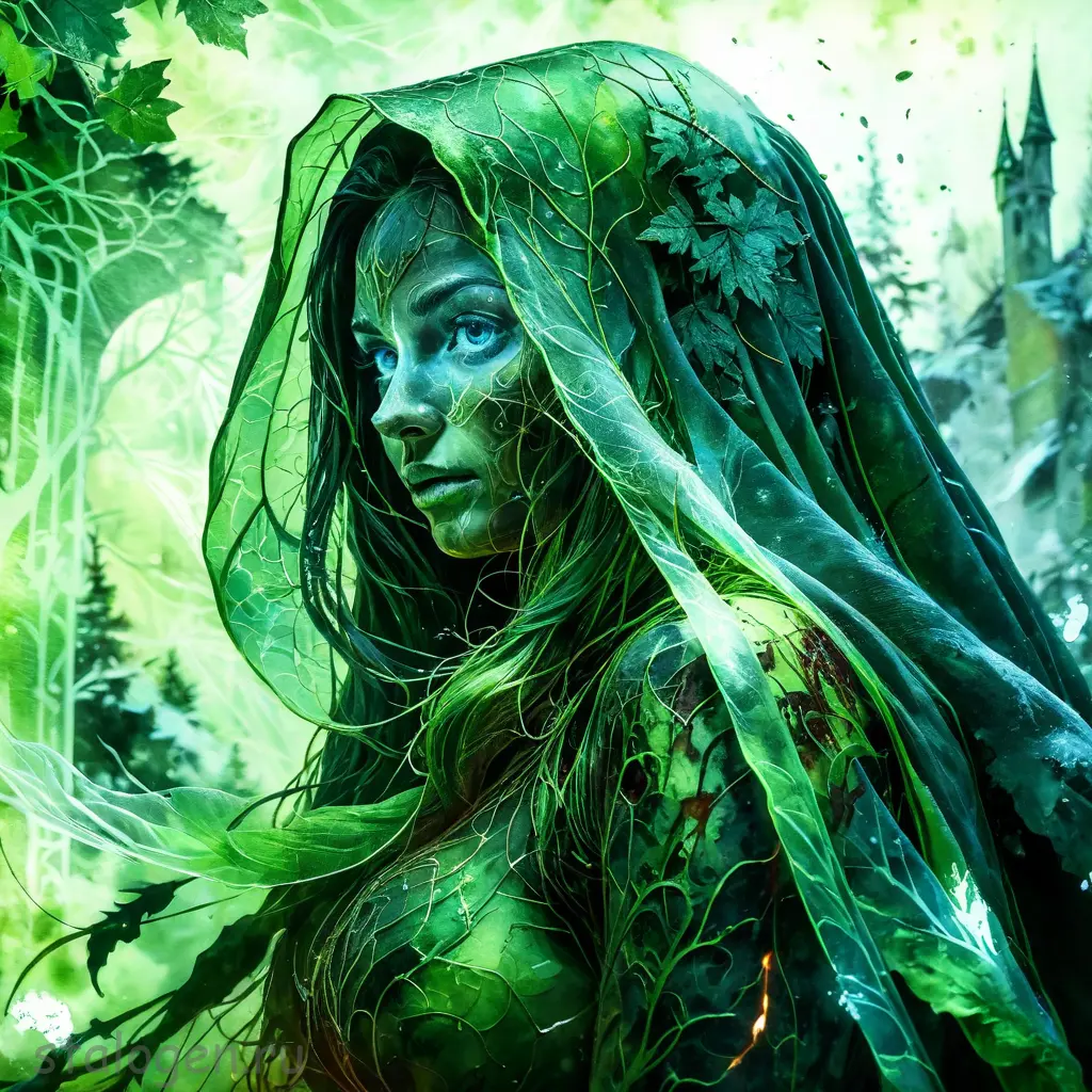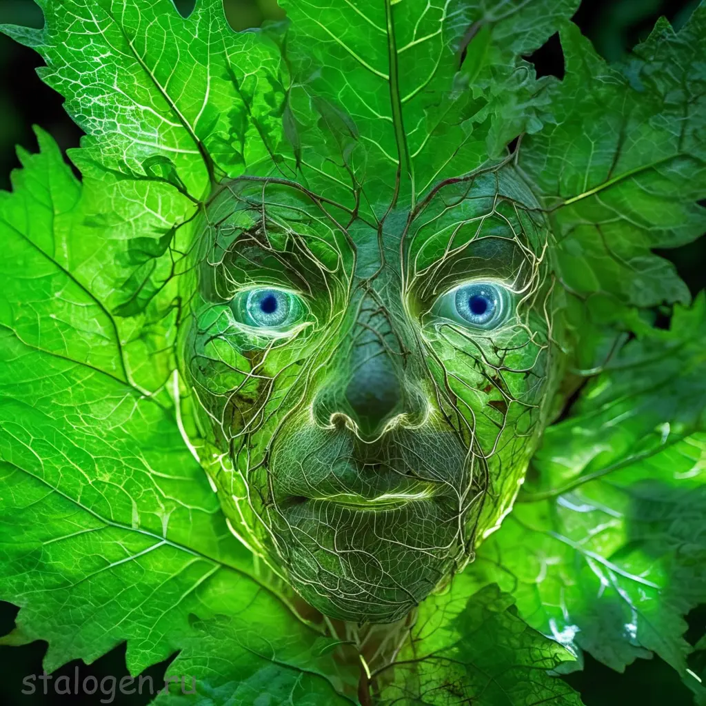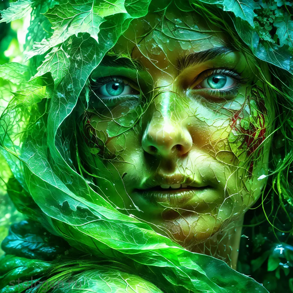 macro shot of a glowing forest spirit,leafy appendages outlined with veins of light,eyes a deep,enigmatic glow amidst the foliage