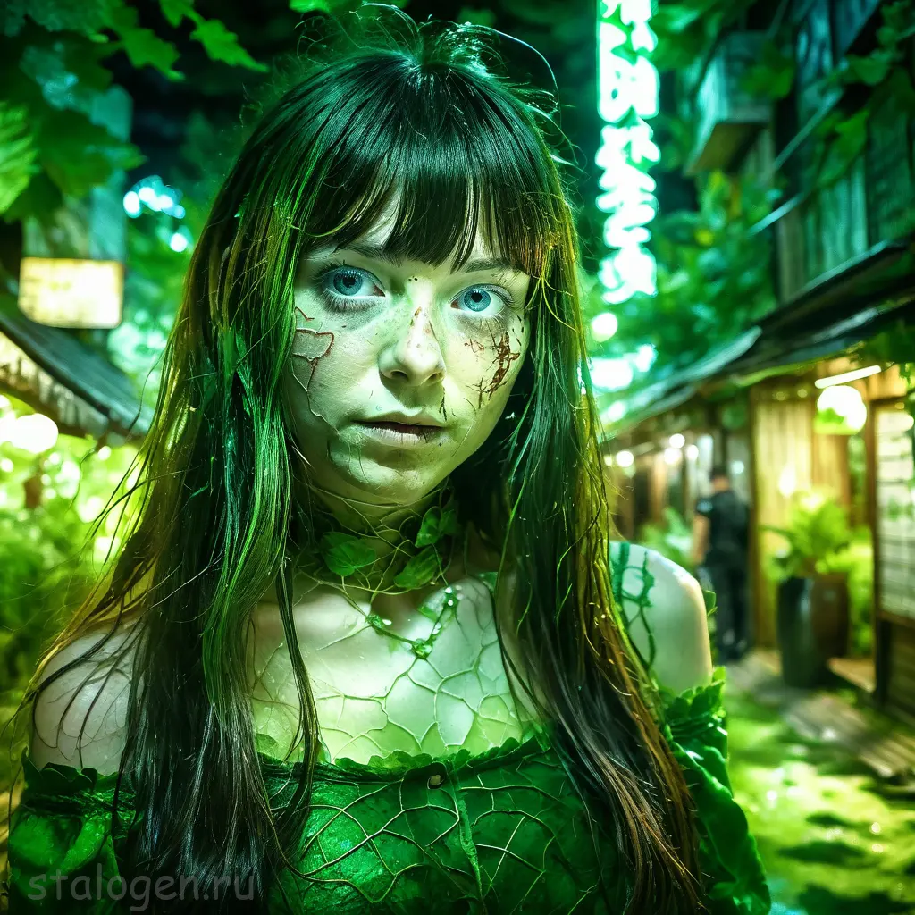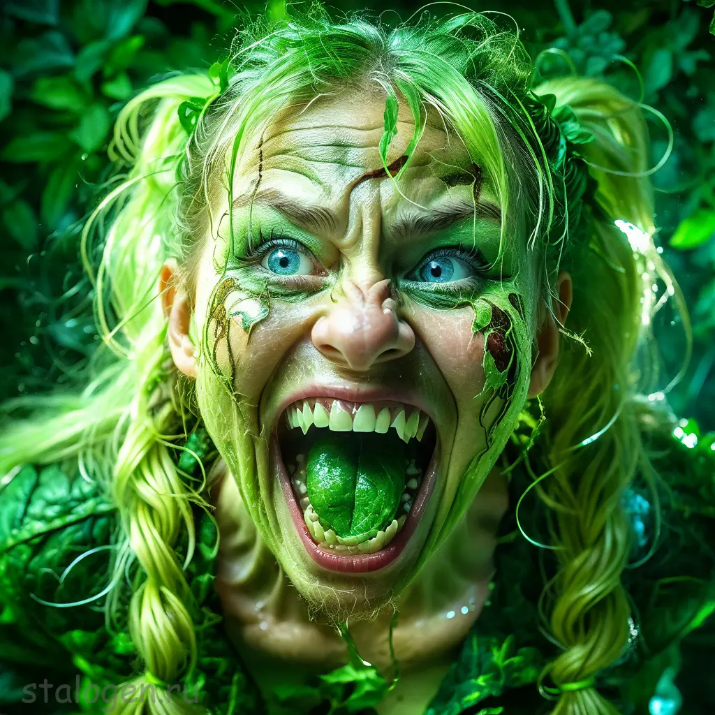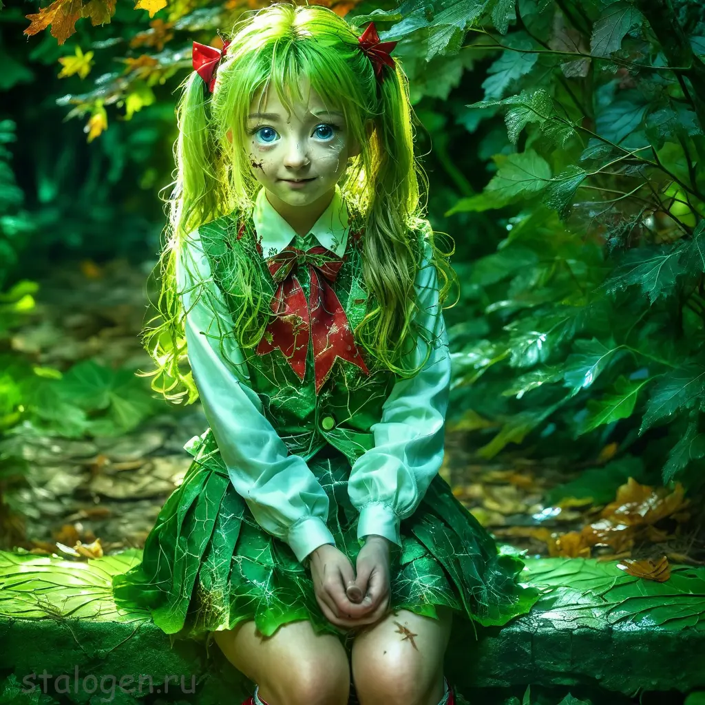 macro shot of a glowing forest spirit,leafy appendages outlined with veins of light,eyes a deep,enigmatic glow amidst the foliage