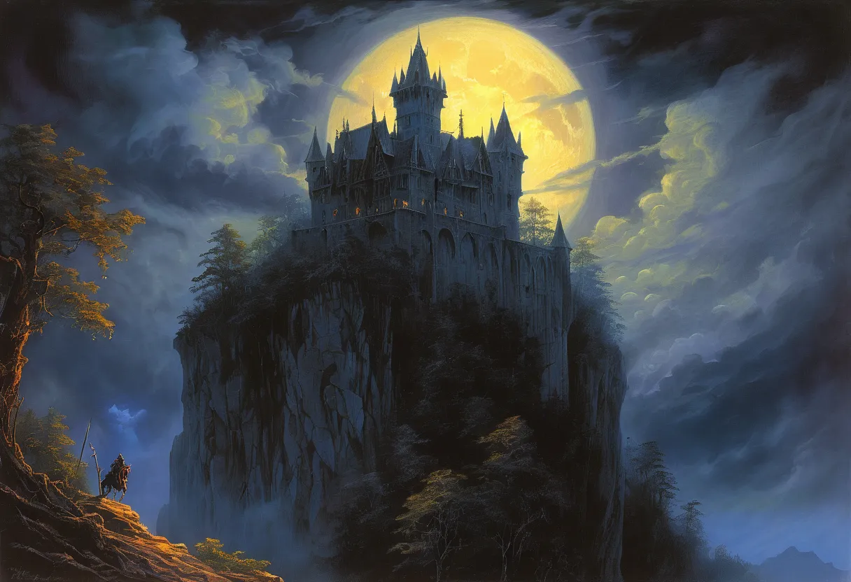 6. Средневековая тематика: Присутствие элементов средневековой фантазии, таких как замки, мечи, магические книги.