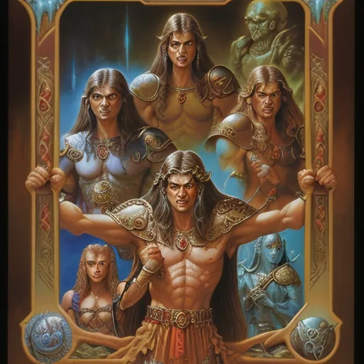 2. Героические фигуры: Персонажи изображаются как мощные, героические фигуры, часто в динамичных позах.