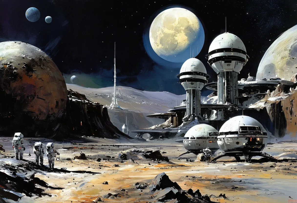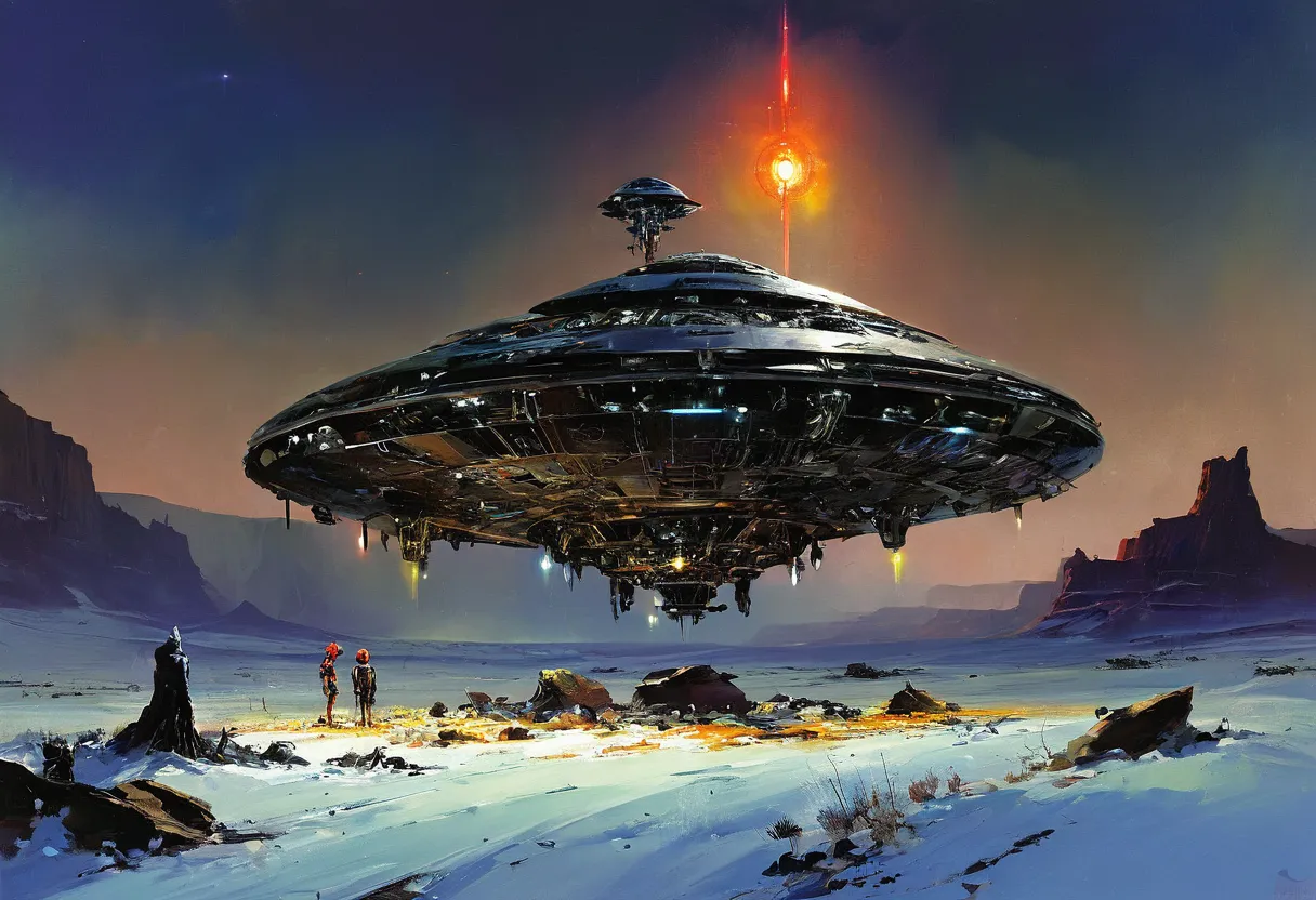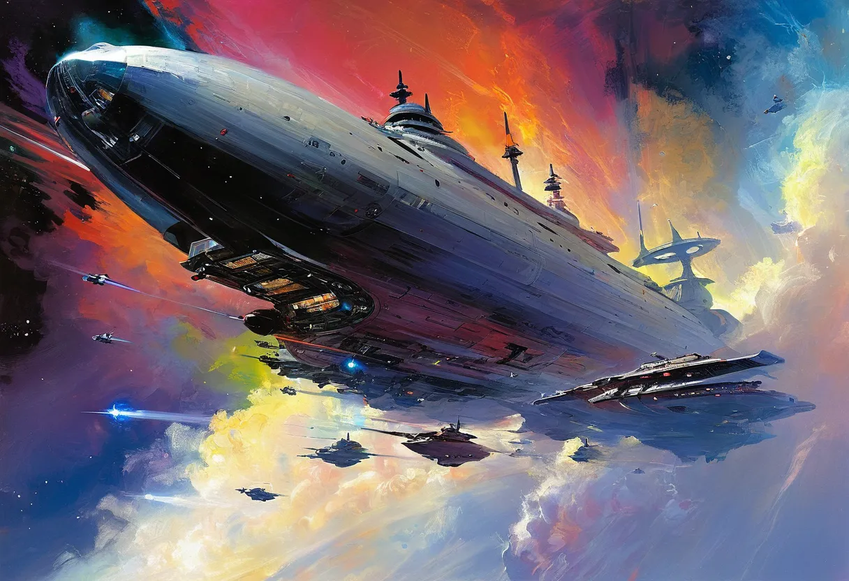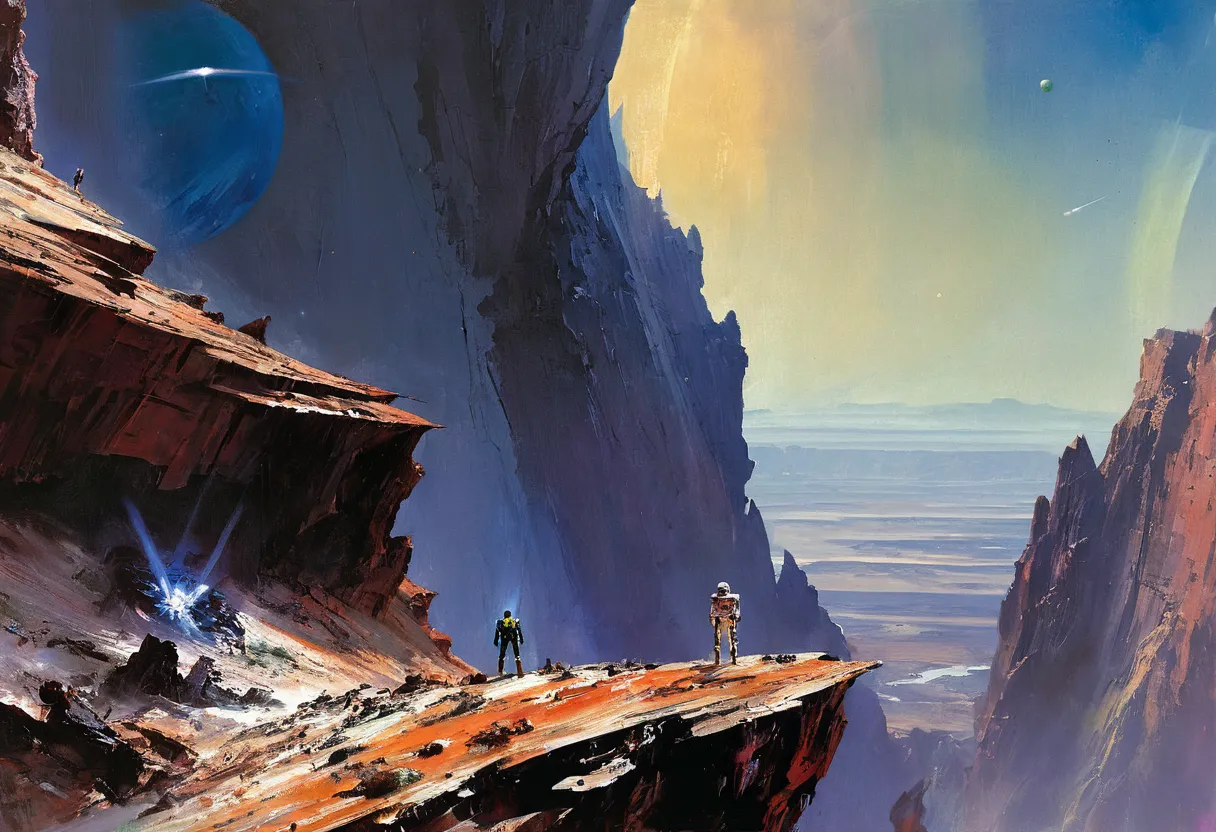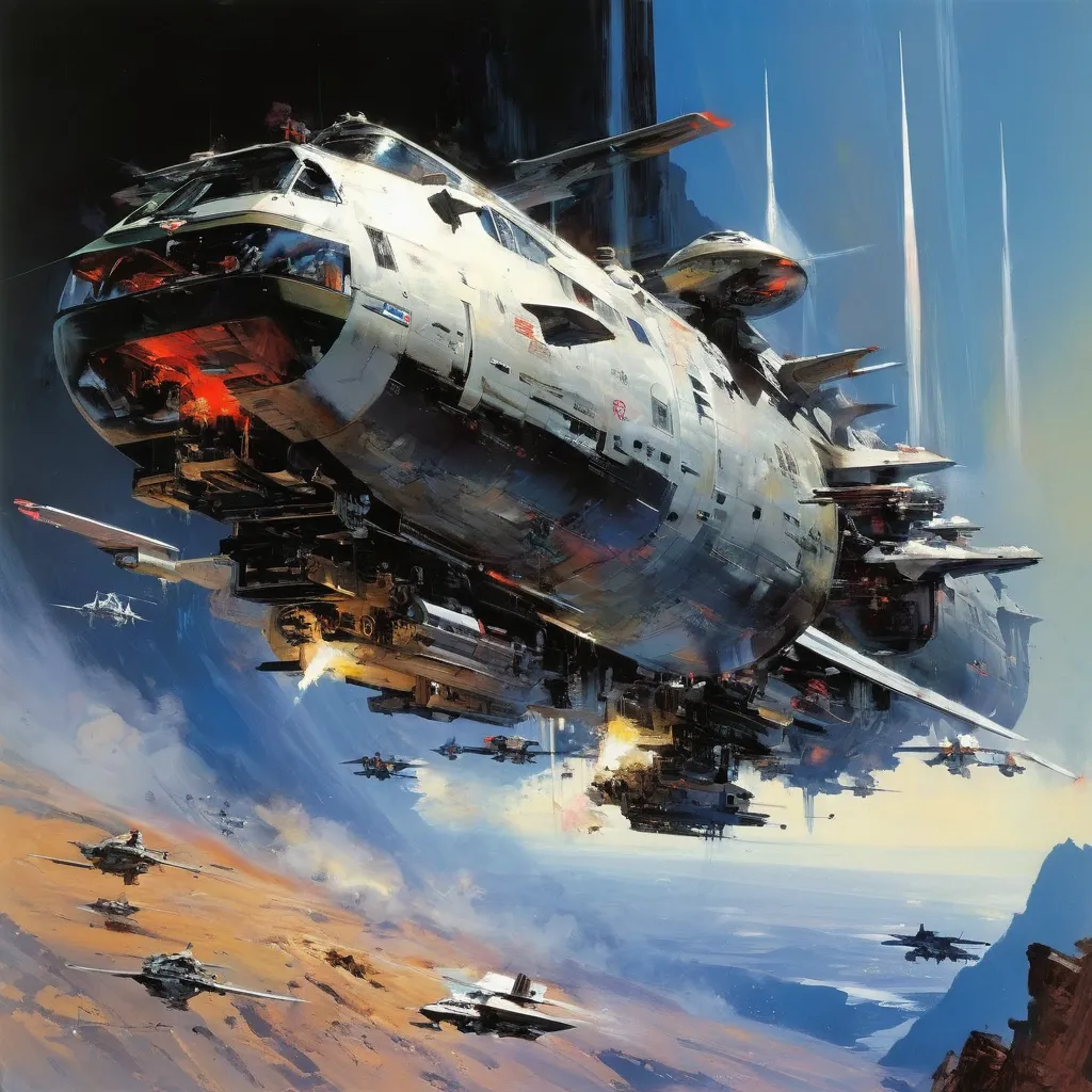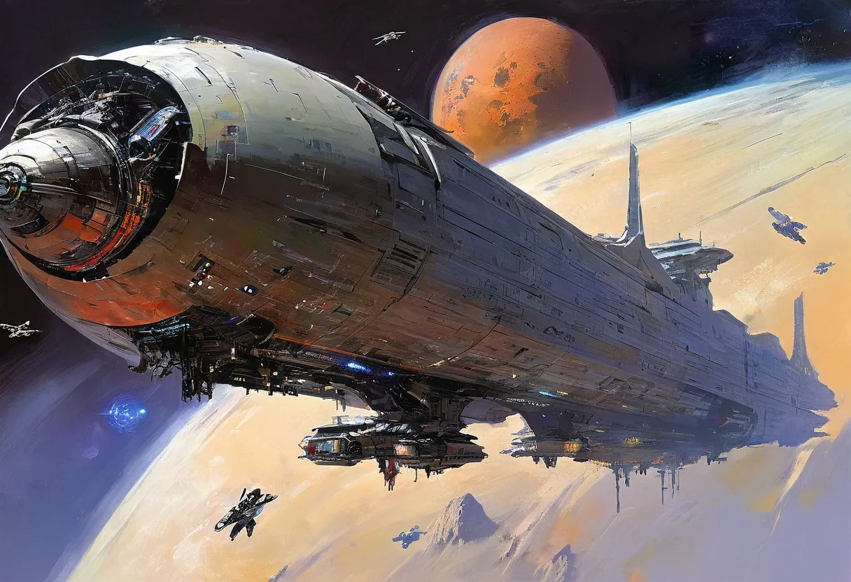 Джон Бёрки (John Berkey) — американский художник, известный своими яркими и детализированными научно-фантастическими иллюстрациями. Его работы часто включают космические корабли, футуристические города и впечатляющие космические пейзажи. Характерные черты его стиля — динамичные композиции, насыщенные цветовые палитры и чувство масштабности.