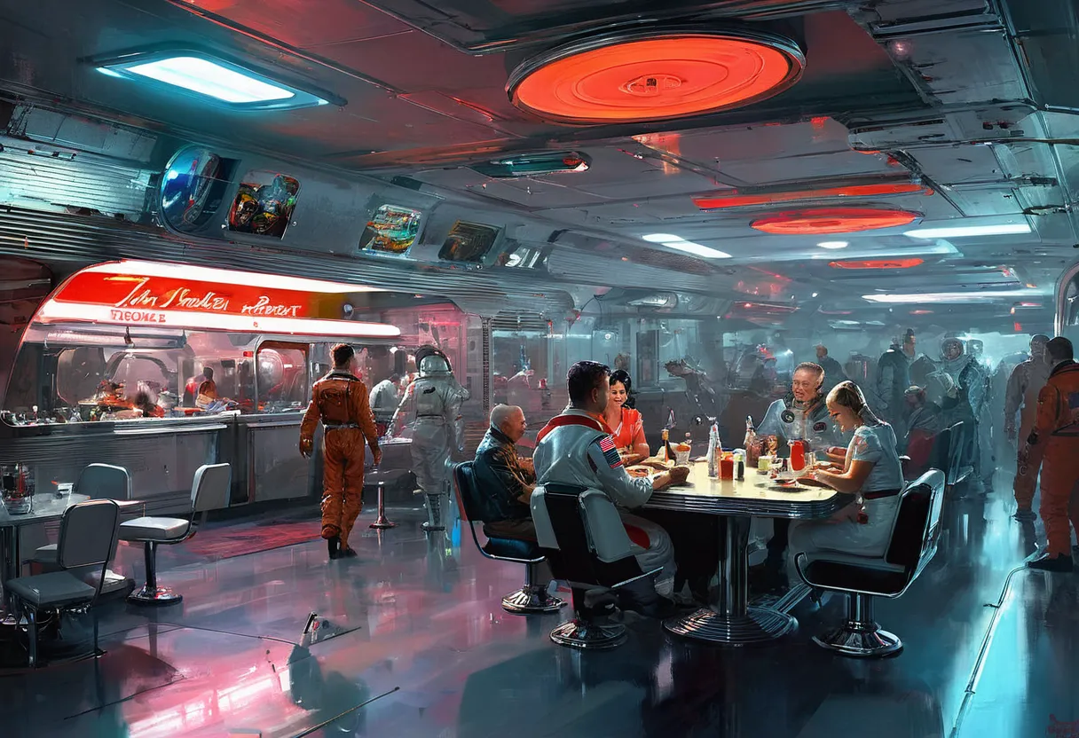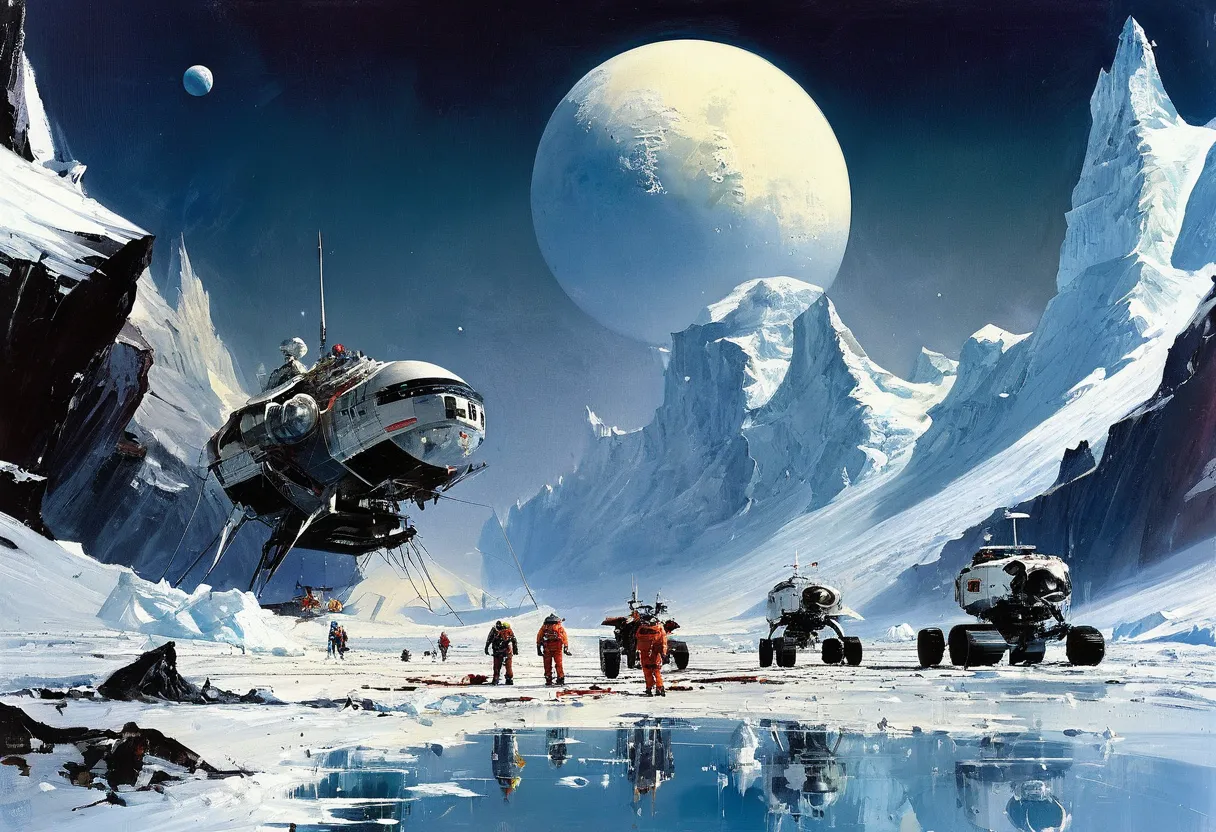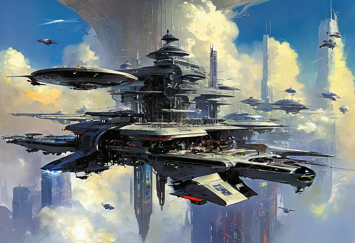 1. Космические и футуристические элементы: Частое присутствие космических кораблей, городов будущего и внеземных ландшафтов.