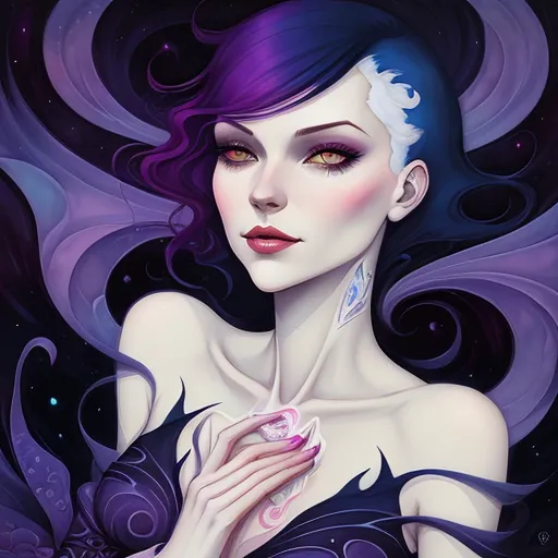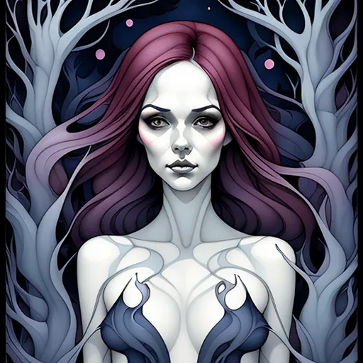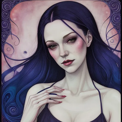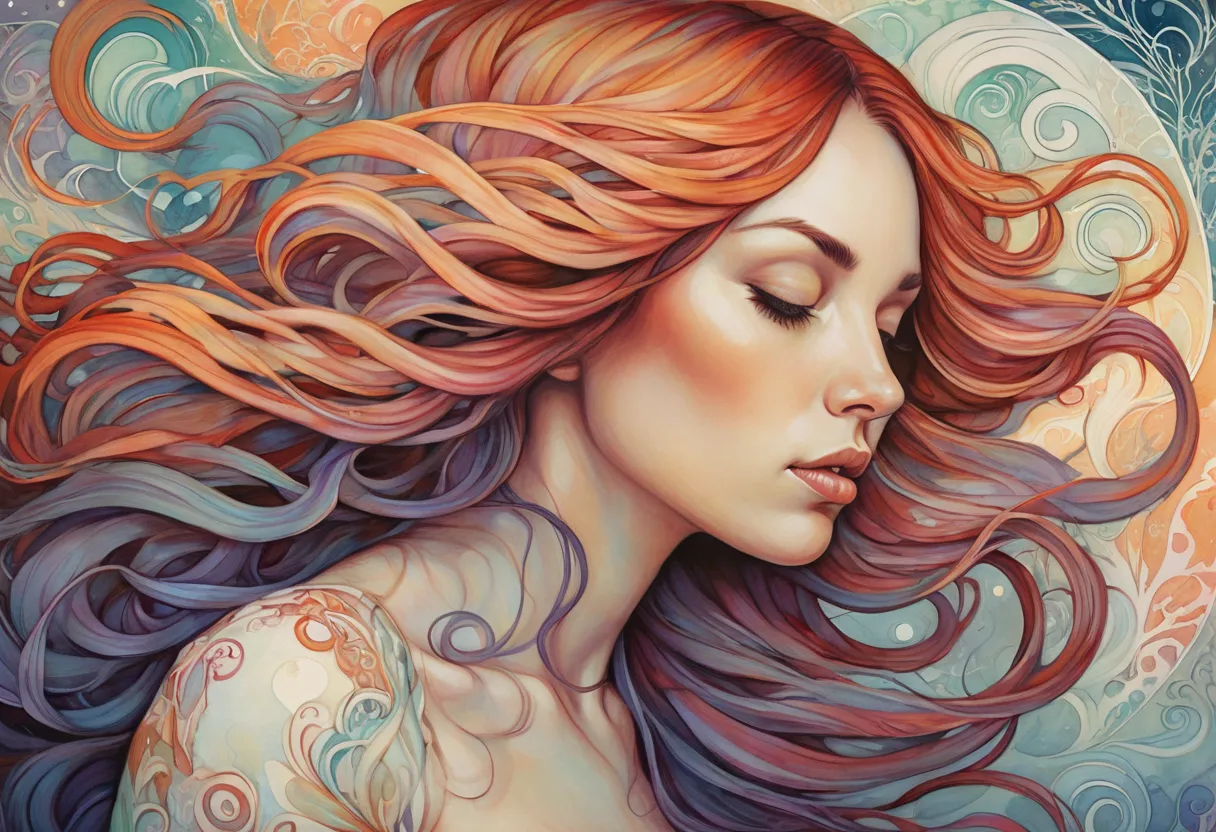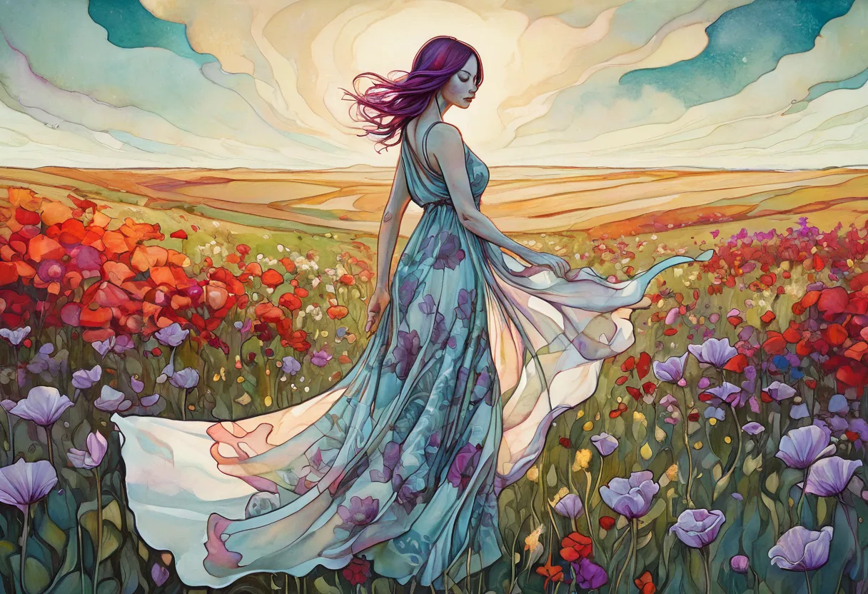 Келли МакКернан (Kelly McKernan) — современная художница, известная своими акварельными работами и фантастическими иллюстрациями. Её стиль характеризуется сочетанием реалистичных и сюрреалистических элементов, яркими цветами, плавными линиями и мягкими градиентами. В работах Келли часто встречаются женские фигуры, элементы природы и абстрактные формы, создающие эмоционально насыщенные композиции.