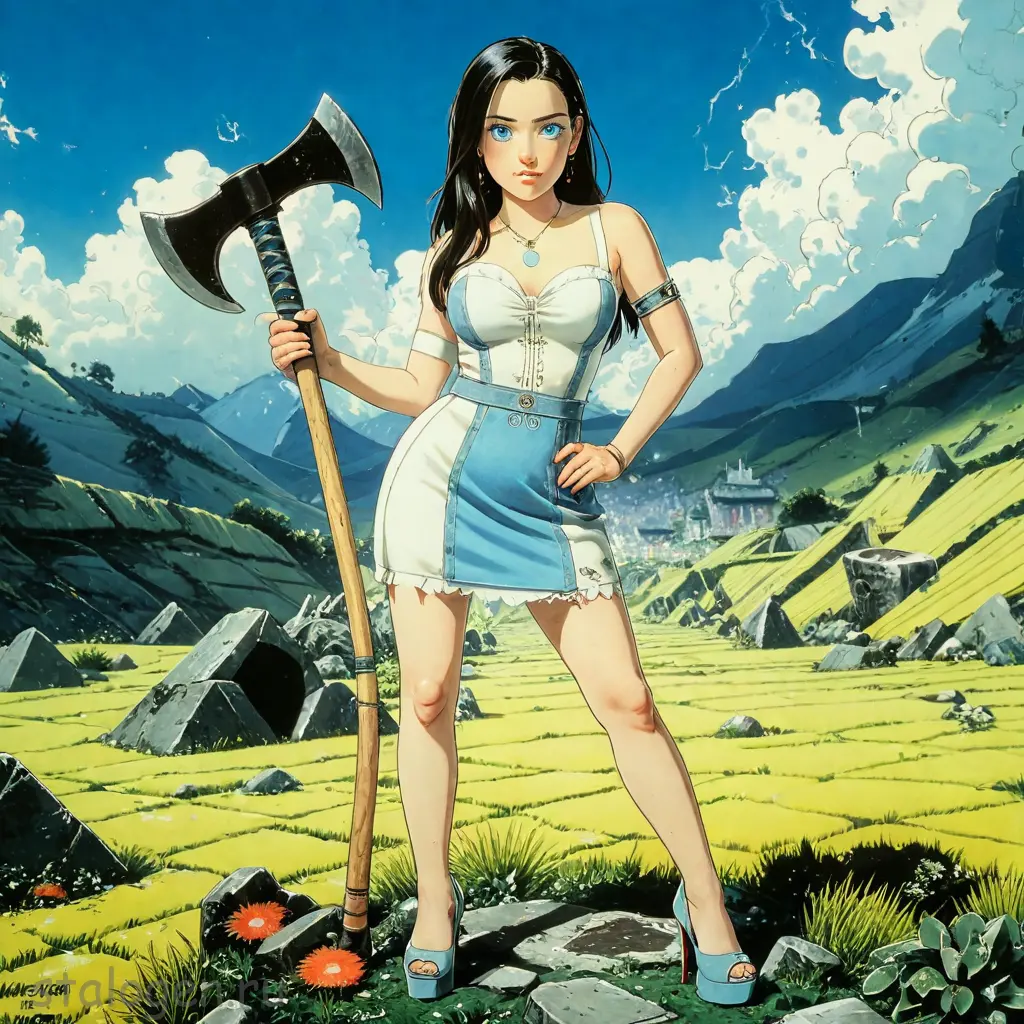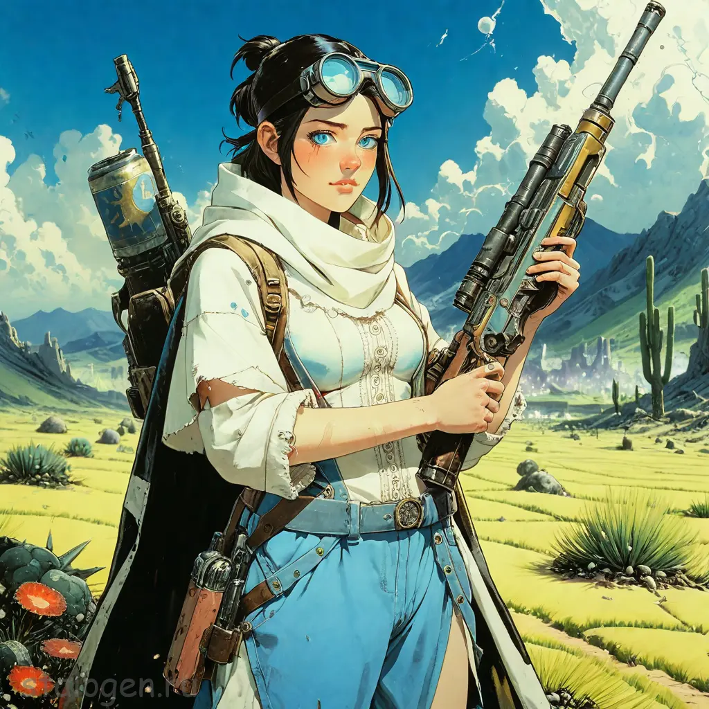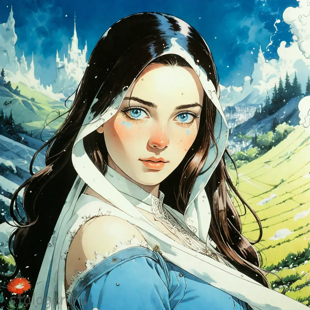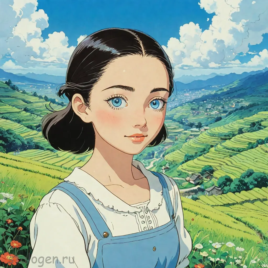 Bright, quaint and serene, breathtaking fabulous landscape with a charming face of a girl, among lush terraced fields, with thin white clouds floating across a bright blue sky, art by Hayao Miyazaki. blue eyes, thick eyebrows, bright makeup