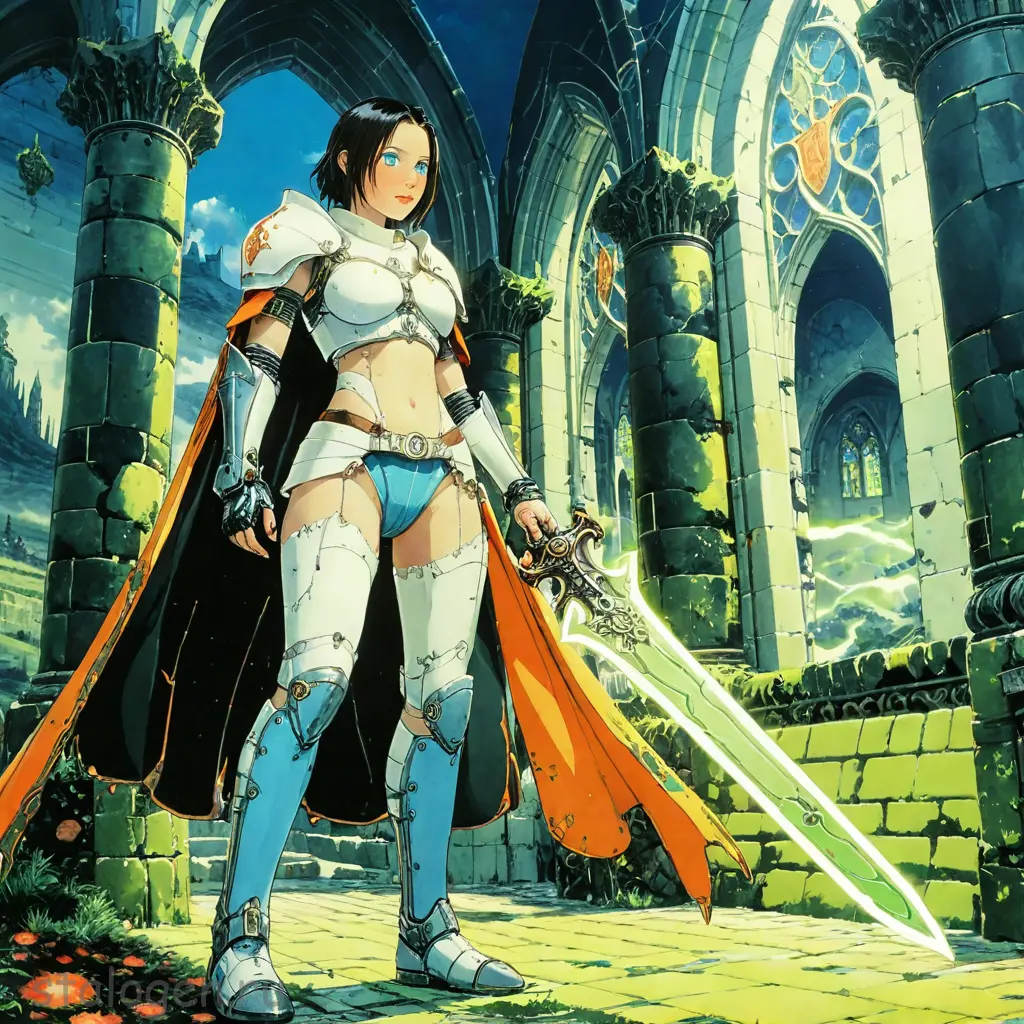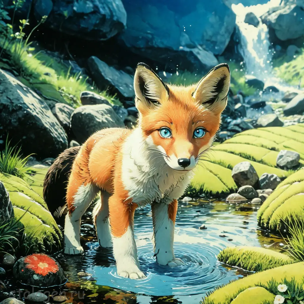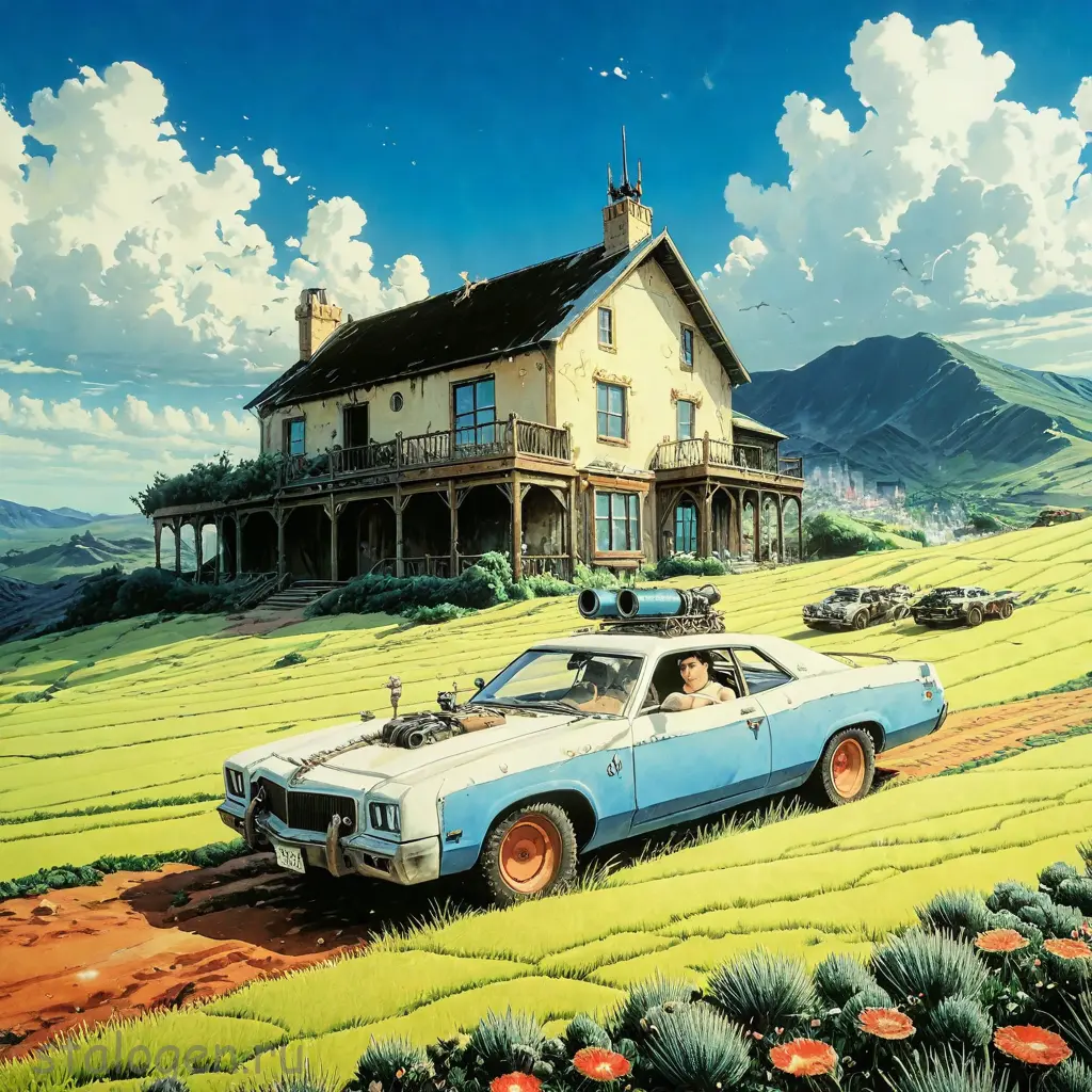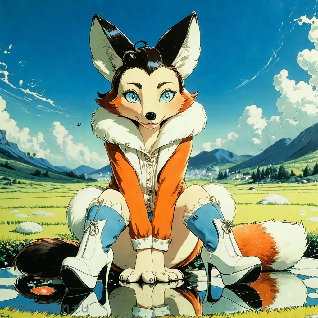 Bright, quaint and serene, breathtaking fabulous landscape with a charming face of a girl, among lush terraced fields, with thin white clouds floating across a bright blue sky, art by Hayao Miyazaki. blue eyes, thick eyebrows, bright makeup