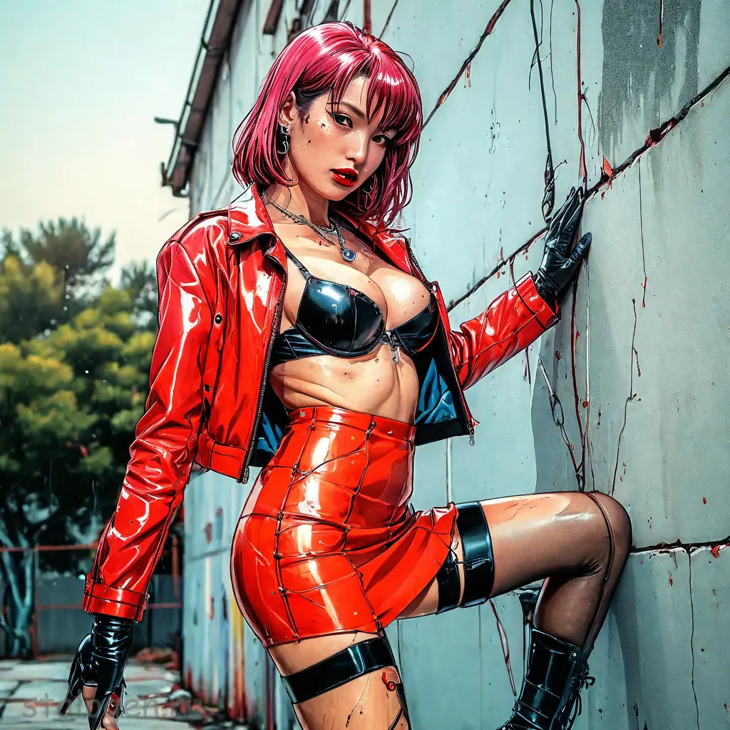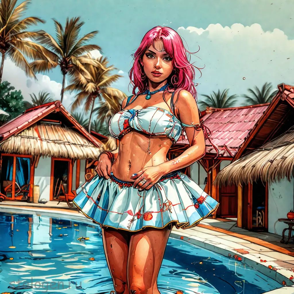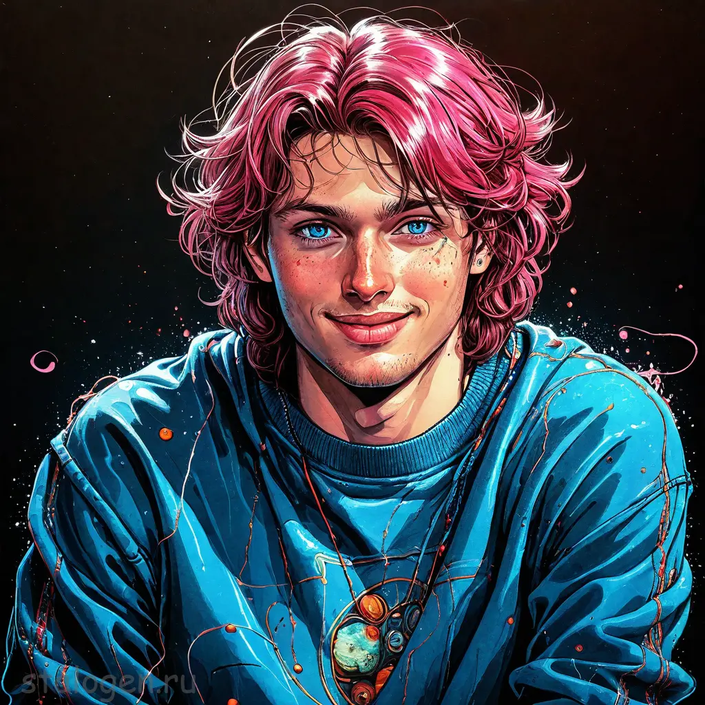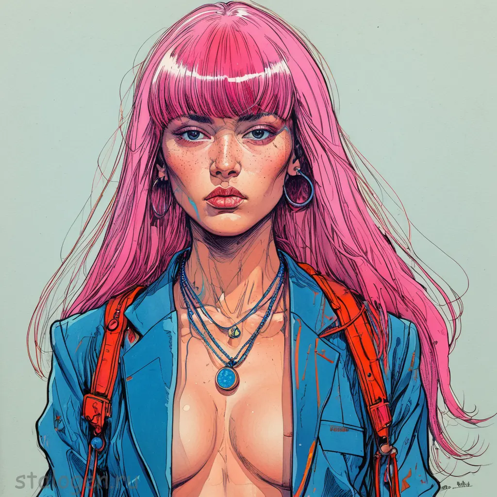 Moebius style page (Jean Giraud), illustration, sketch, 1girl, solo, portrait, round chest, sporty, toned, detailed skin, delicate skin, bright blazer in the style of street art, neckline, without bra, pink hair, long hair, oblique bangs, smooth hair, bangs over one eye, necklace that emphasizes the size of the chest, fashionable posture, strict mood, direct posture, lipstick, mascara, blue art in the style of hippies, blue art in the style of orientisto, oriental color, orientista in the art of the spector in the style of black color, oriental style of color, oriential art, oriental color color, oriental color.