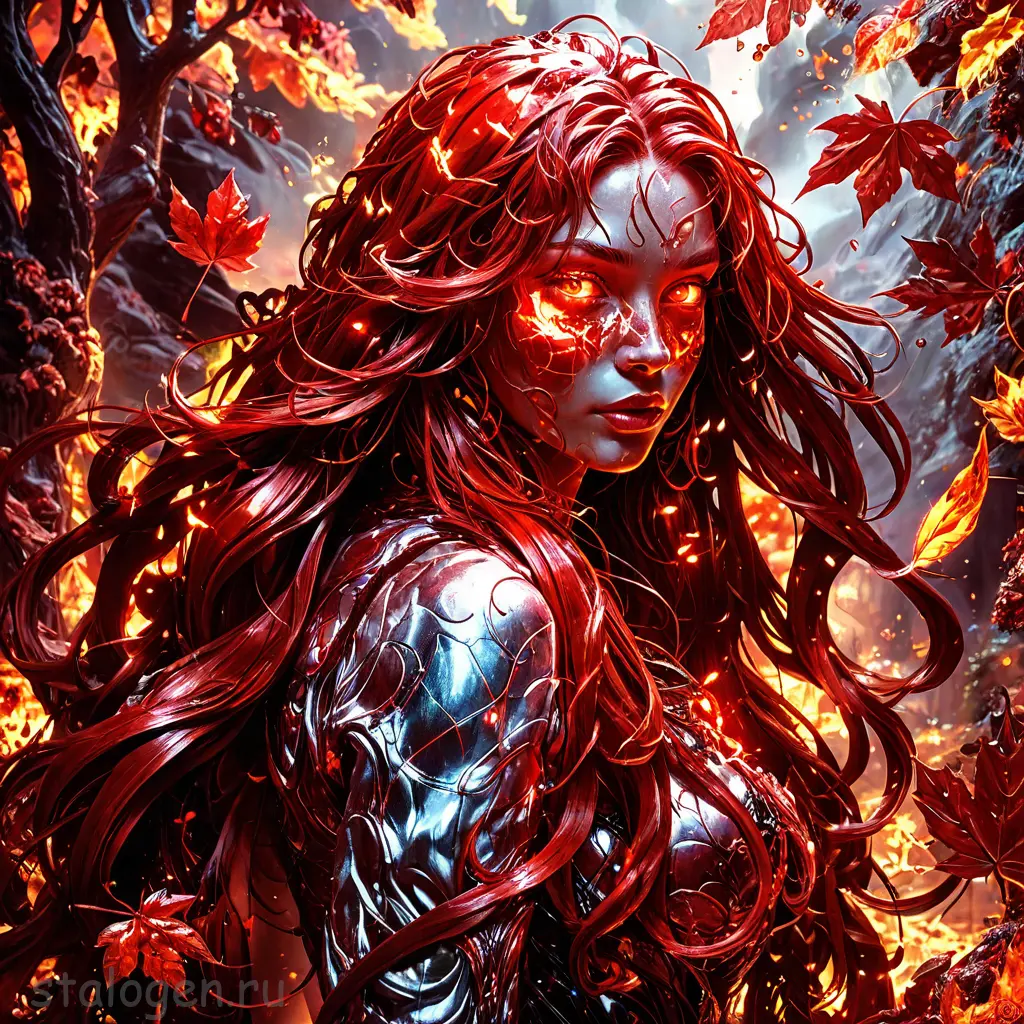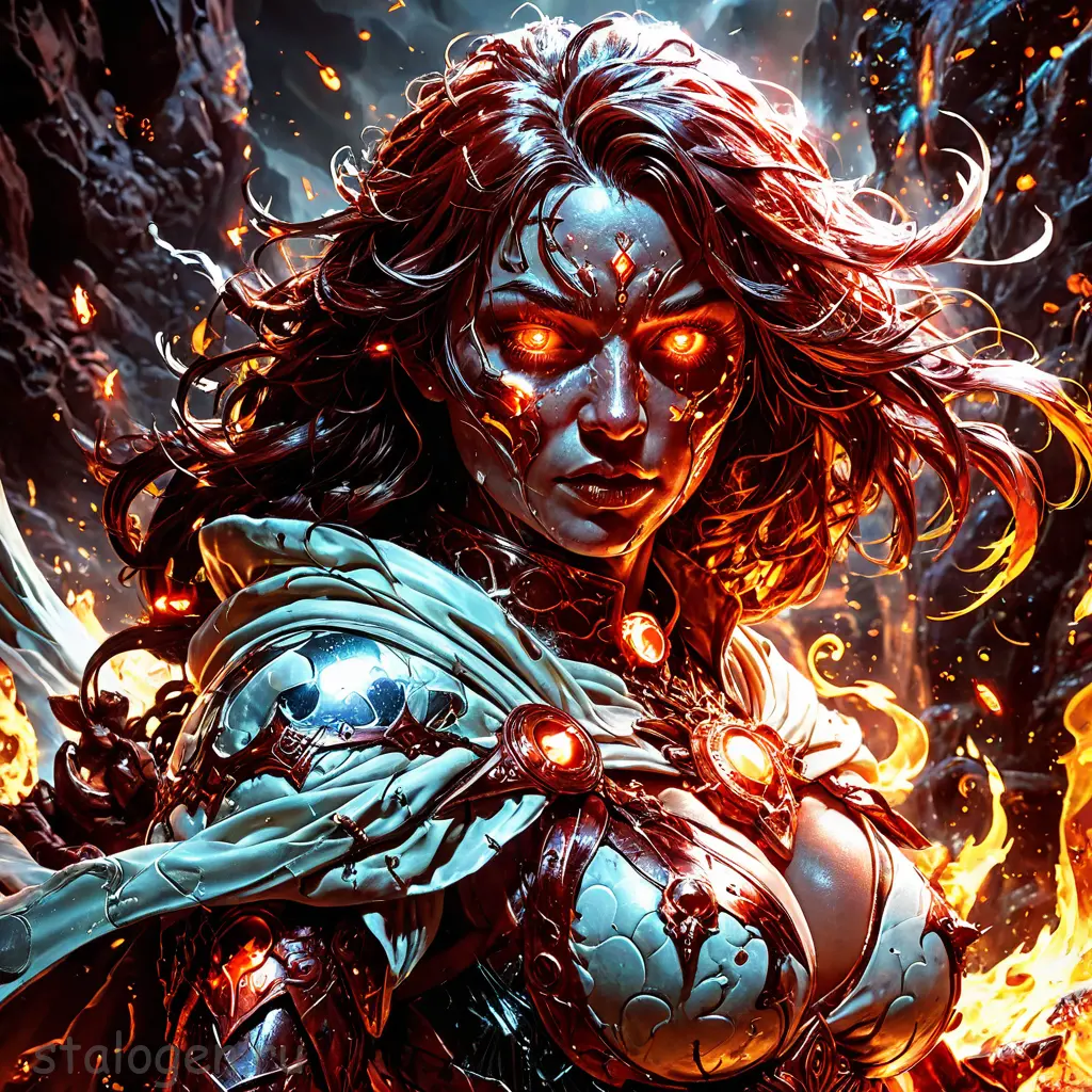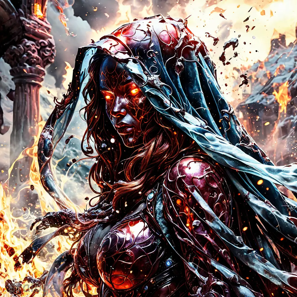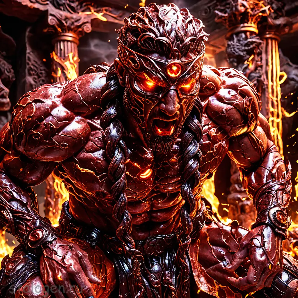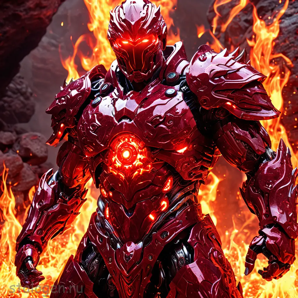 realistic photograhy of the attractive muscular man, futuristic, robotic, mechanical , ruby,a warrior spirit clad in crimson armor glowing with inner fire, ruby shards embedded in his skin, surrounded by flames and molten rock, volumetric lighting, highly detailed, intricate details, detailed background